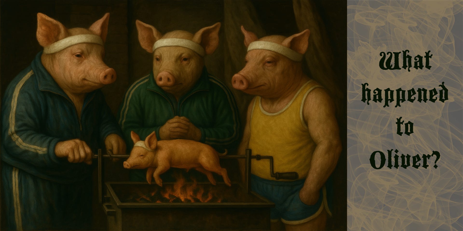 The fire crackled, licking at the metal grate of the barbecue. Three pigs stood around it, clad in old-fashioned runner outfits, sweatbands clinging to their bristled foreheads. The night air was thick with the scent of roasting meat—something rich, smoky, strangely familiar.